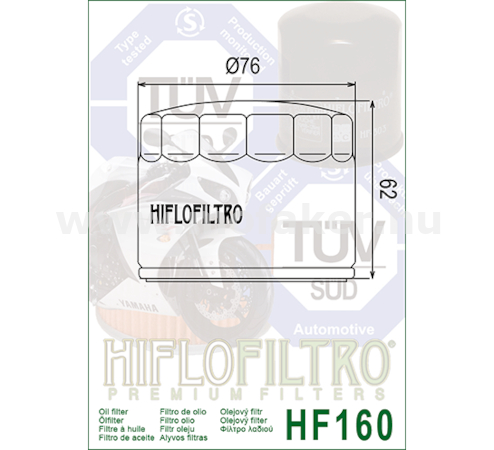A HifloFiltro HF160 a világ elsö és egyetlen TÜV jóváhagyással rendelkezö motorkerékpár olajszurö családjának tagja. Ez a típus kiemelkedö szurési hatékonyságot és motorvédelmet biztosít a modern, nagy teljesítményu BMW motorkerékpárok számára.
