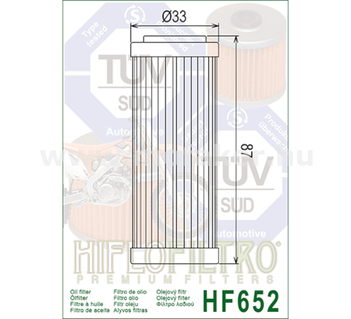 A HifloFiltro HF652 a világ elsö és egyetlen TÜV jóváhagyással rendelkezö motorkerékpár olajszurö családjának tagja. A gyártás során felhasznált prémium alapanyagok és a precíz minöségellenörzés garantálja, hogy a szurö teljesítménye megegyezik a gyári (OEM) alkatrészekével, vagy akár túl is szárnyalja azokat.